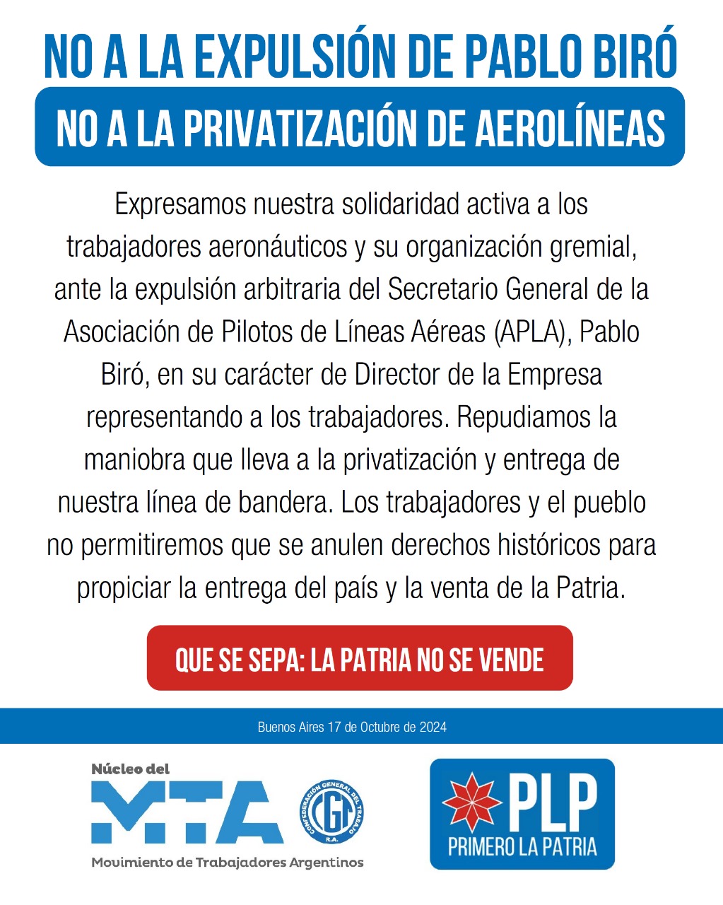 No a la expulsión de Pablo Biró | No a la privatización de Aerolineas Argenintas